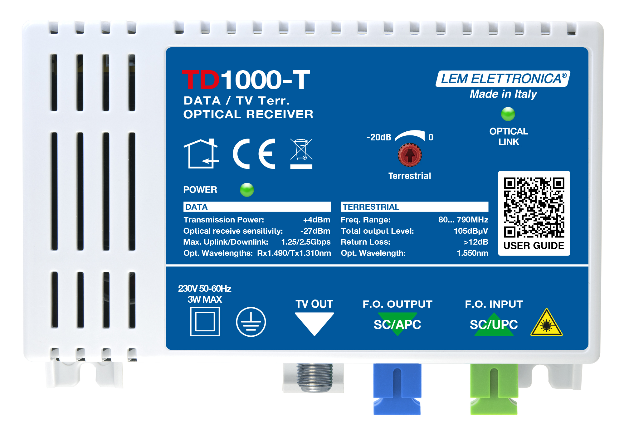 ONT multiservizio professionale per la ricezione dei servizi IP di una rete GPON e delle trasmissioni della TV Terrestre mediante una singola fibra ottica.