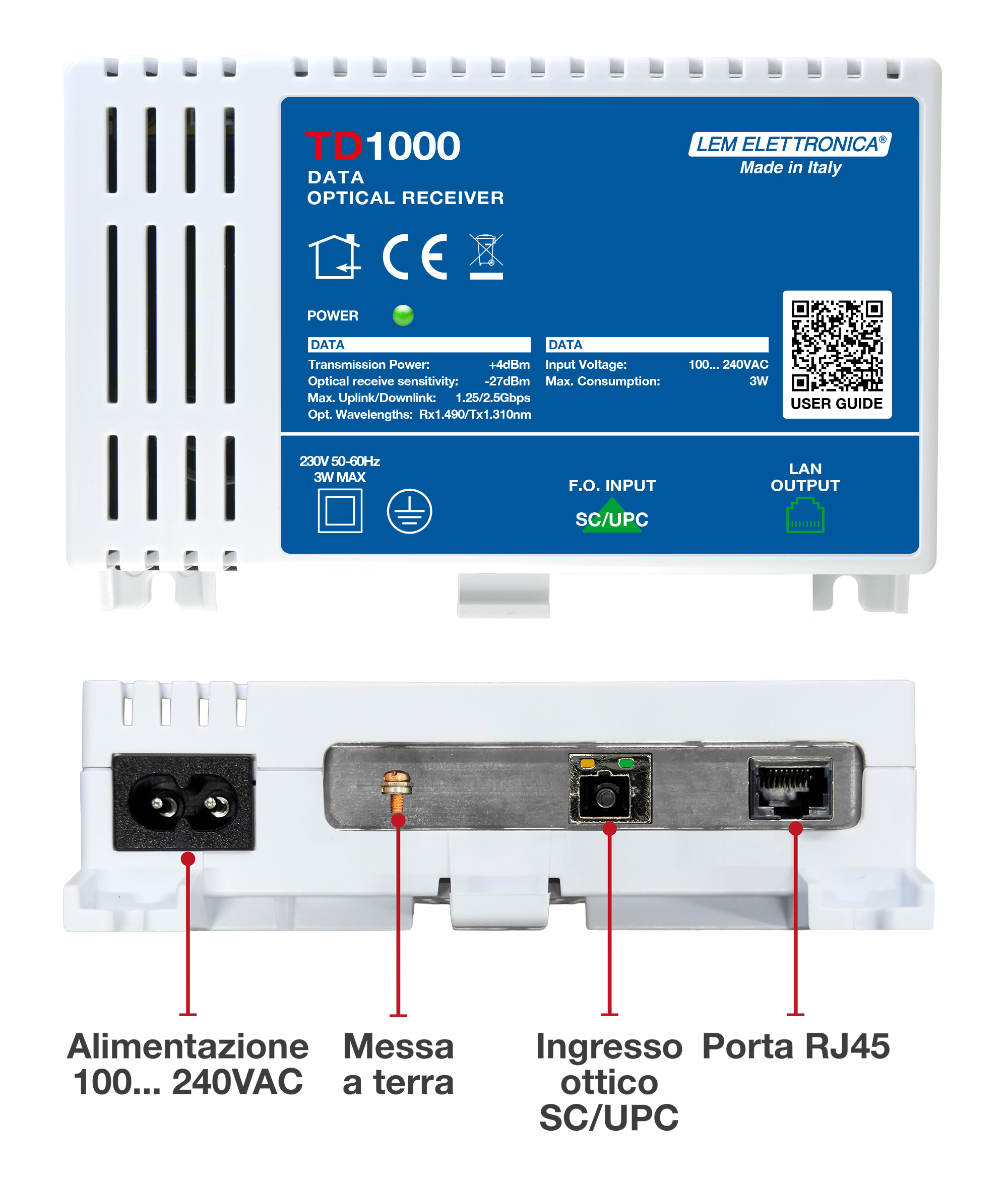 ONT multiservizio professionale per la ricezione dei servizi IP di una rete GPON mediante una singola fibra ottica.